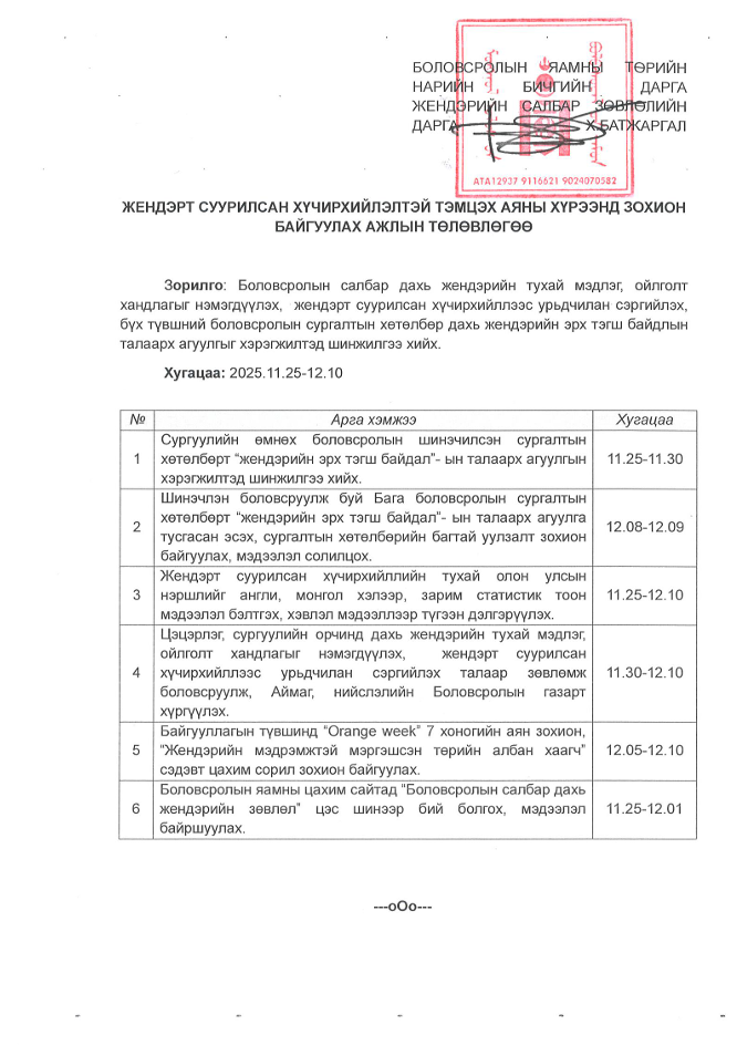 МЭРГЭЖЛИЙН БОЛОН ТЕХНИКИЙН БОЛОВСРОЛЫН СУРГАЛТЫН БАЙГУУЛЛАГЫН ТУСГАЙ БОЛОН ЭНГИЙН ЗӨВШӨӨРӨЛ