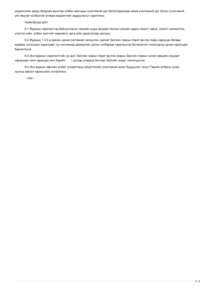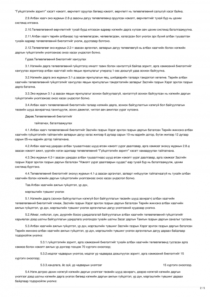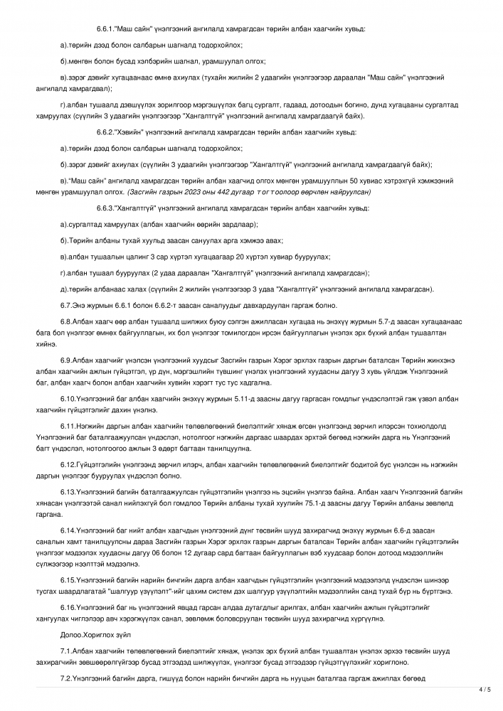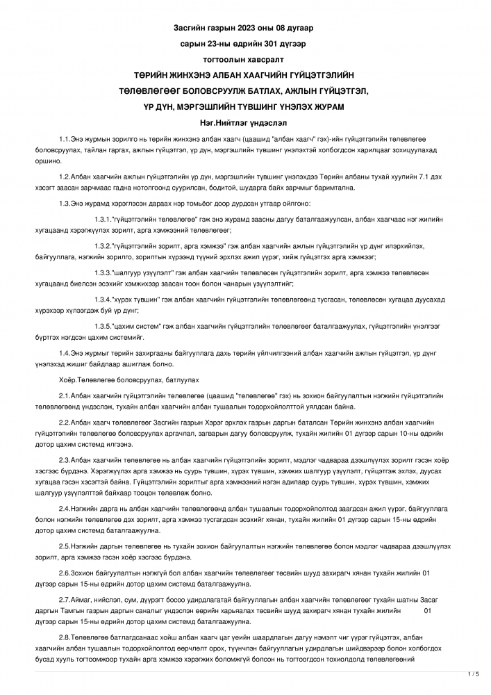 Эх сурвалж: Засгийн газрын 2023 оны 08 дугаар сарын 23-ны өдрийн 301 дүгээр тогтоолын хавсаралт ТӨРИЙН ЖИНХЭНЭ АЛБАН ХААГЧИЙН ГҮЙЦЭТГЭЛИЙН ТӨЛӨВЛӨГӨӨГ БОЛОВСРУУЛЖ БАТЛАХ, АЖЛЫН ГҮЙЦЭТЭЛ, ҮР ДҮН, МЭРГЭШЛИЙН ТҮВШИНГ ҮНЭЛЭХ ЖУРАМ