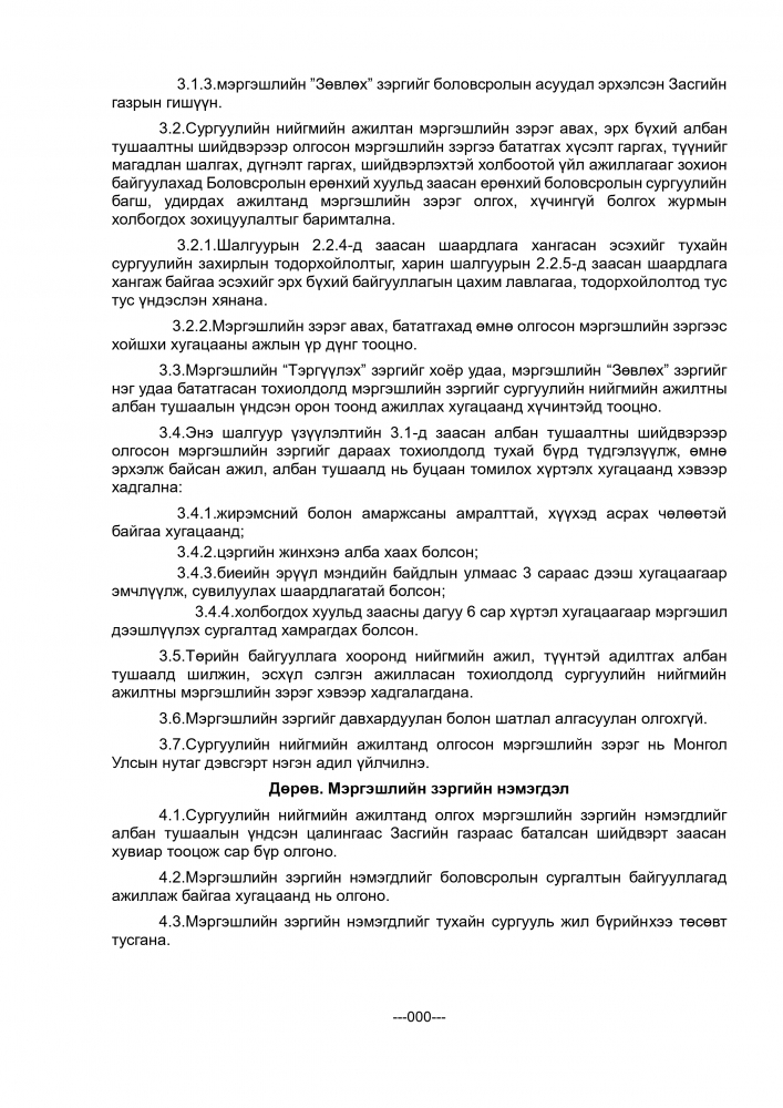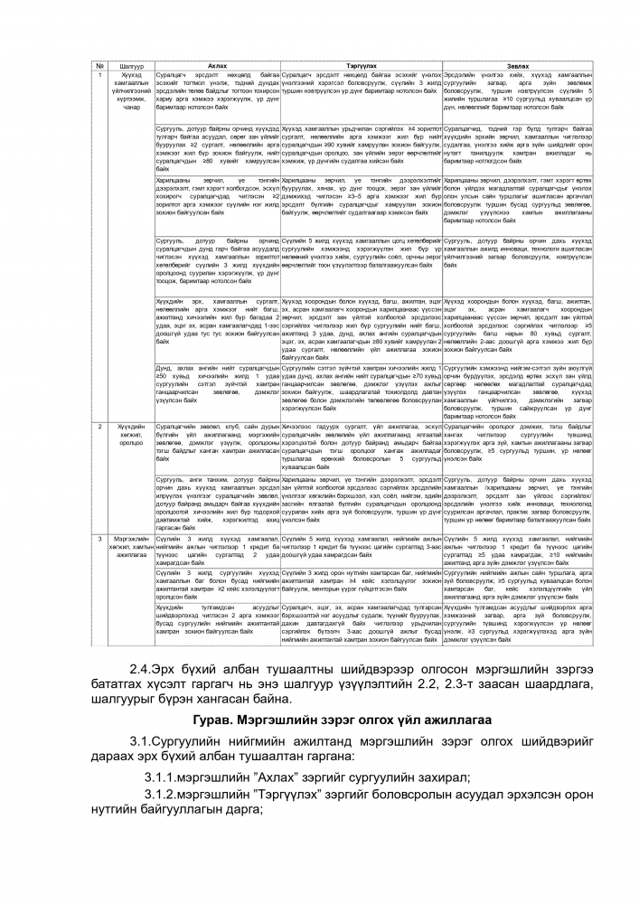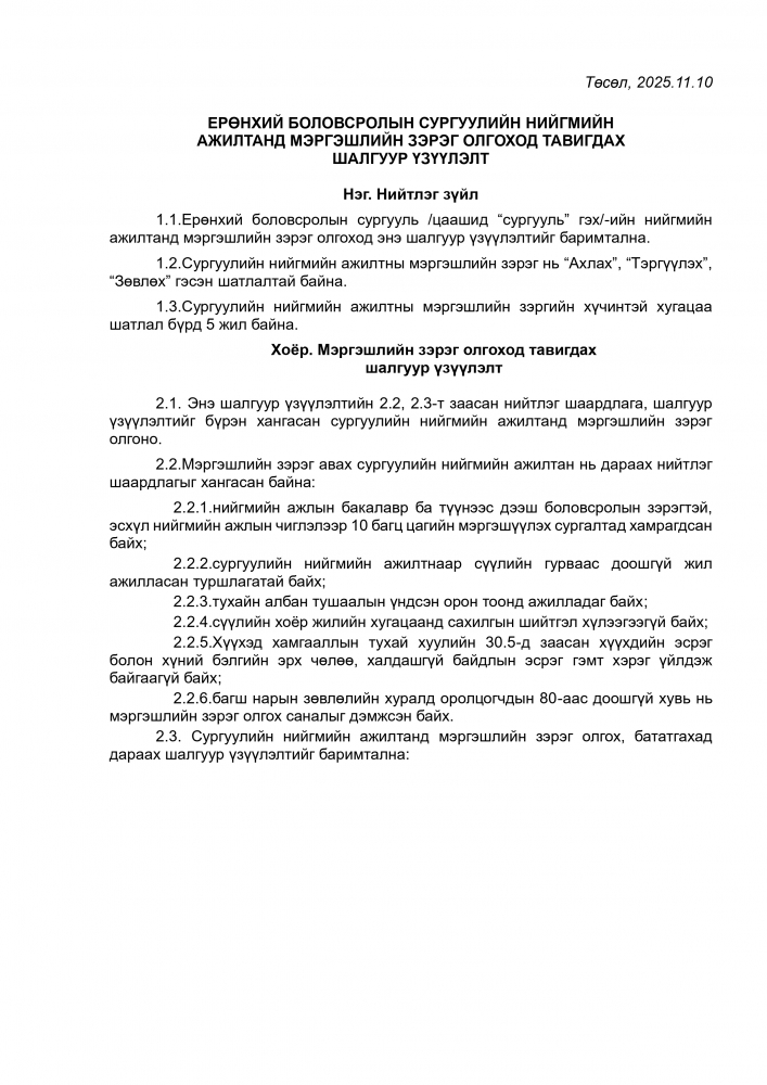 Захиргааны ерөнхий хуулийн 62.1-д "Захиргааны хэм хэмжээний актын төслийг тухайн захиргааны байгууллагын цахим хуудас болон мэдээллийн самбарт 30-аас доошгүй хоногийн хугацаанд байрлуулж санал авна" гэж заасны дагуу боловсрол, хөдөлмөр, нийгмийн хамгаалал, санхүүгийн асуудал эрхэлсэн Засгийн газрын гишүүн хамтран батлах "Ерөнхий боловсролын сургуулийн нийгмийн ажилтанд мэргэшлийн зэрэг олгоход тавигдах шалгуур үзүүлэлт"-ийн төсөлд санал авч байна.