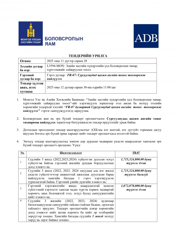 МЭРГЭЖЛИЙН БОЛОН ТЕХНИКИЙН БОЛОВСРОЛЫН СУРГАЛТЫН БАЙГУУЛЛАГЫН ТУСГАЙ БОЛОН ЭНГИЙН ЗӨВШӨӨРӨЛ