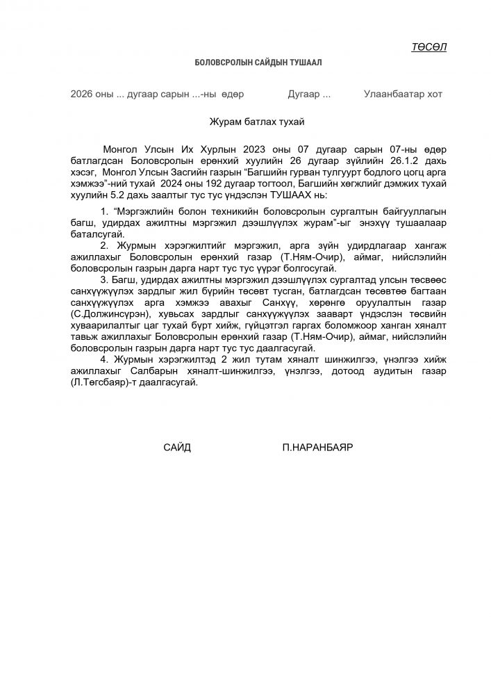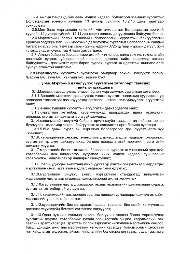 "Мэргэжлийн болон техникийн боловсролын сургалтын байгууллагын багш, удирдах ажилтны мэргэжил дээшлүүлэх журам"-ын төсөлтэй танилцан саналаа tugsjargal@moe.gov.mn хаягаар 2026 оны 03 дугаар сарын 27-ны өдрийн дотор ирүүлнэ үү.