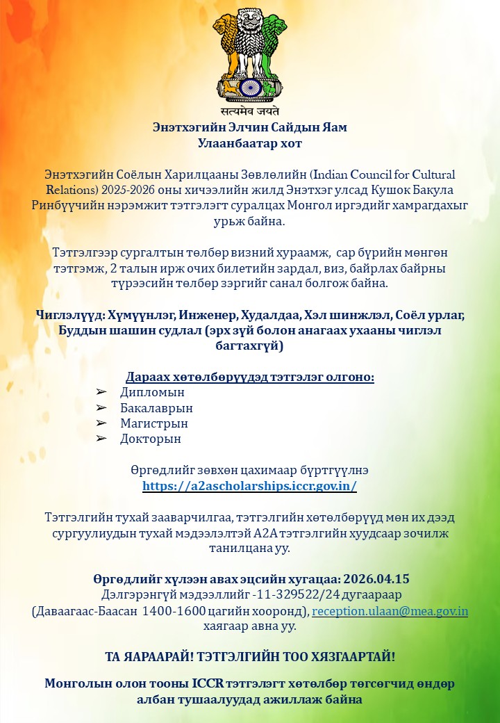 Энэтхэгийн Соёлын харилцааны зөвлөл (Indian Council for Cultural Relations)-өөс 2026-2027 оны хичээлийн жилийн Кушок Бакула Ринбүүчийн нэрэмжит тэтгэлэгт хөтөлбөрийг зарлалаа.
