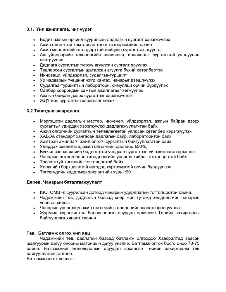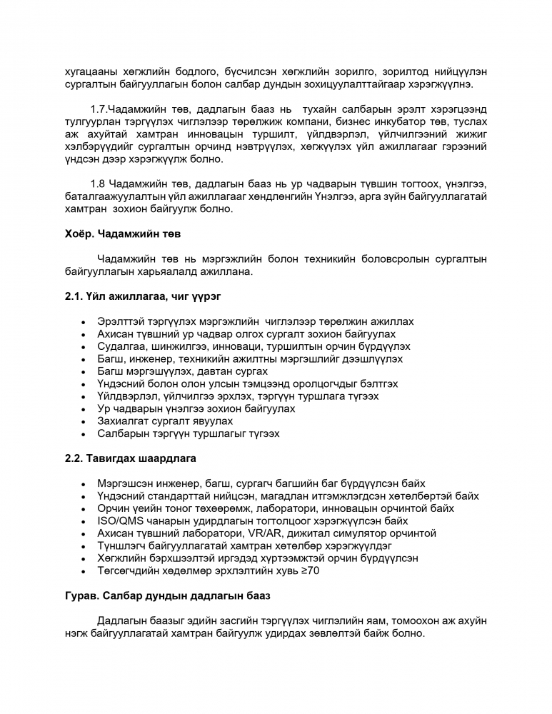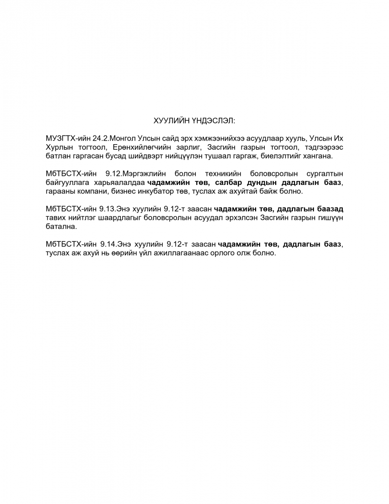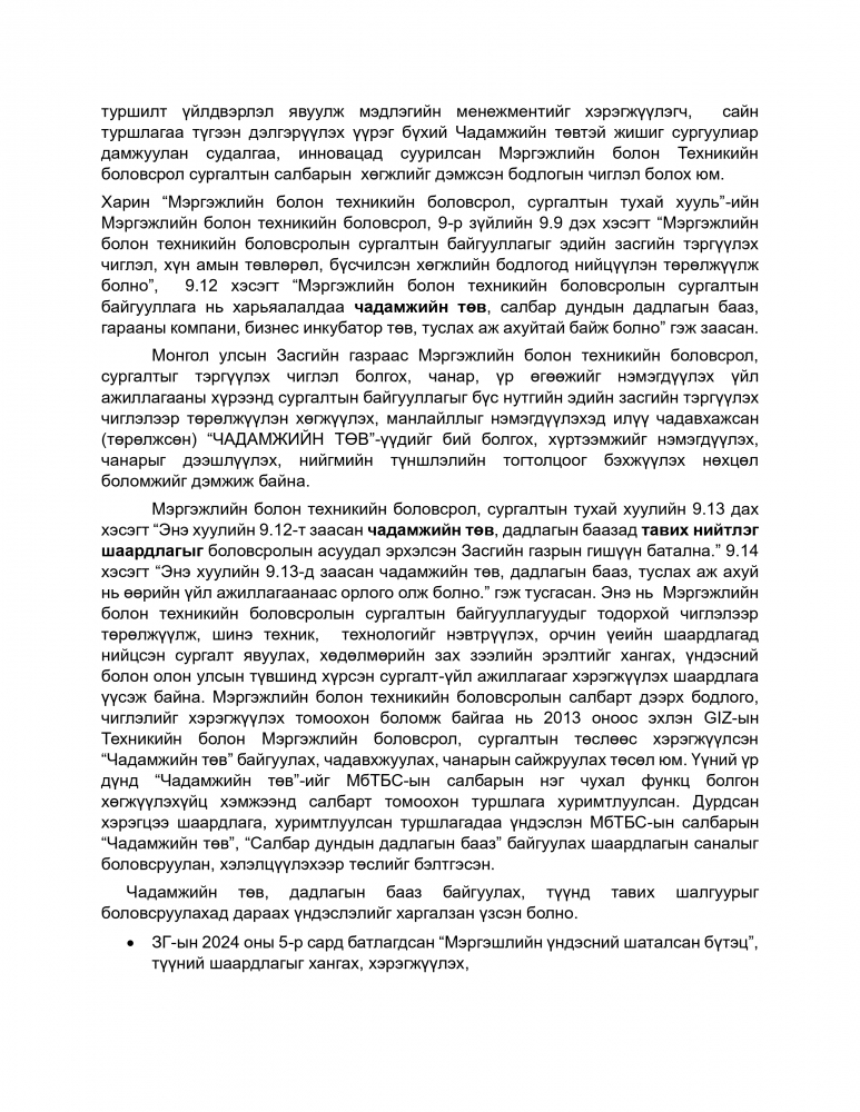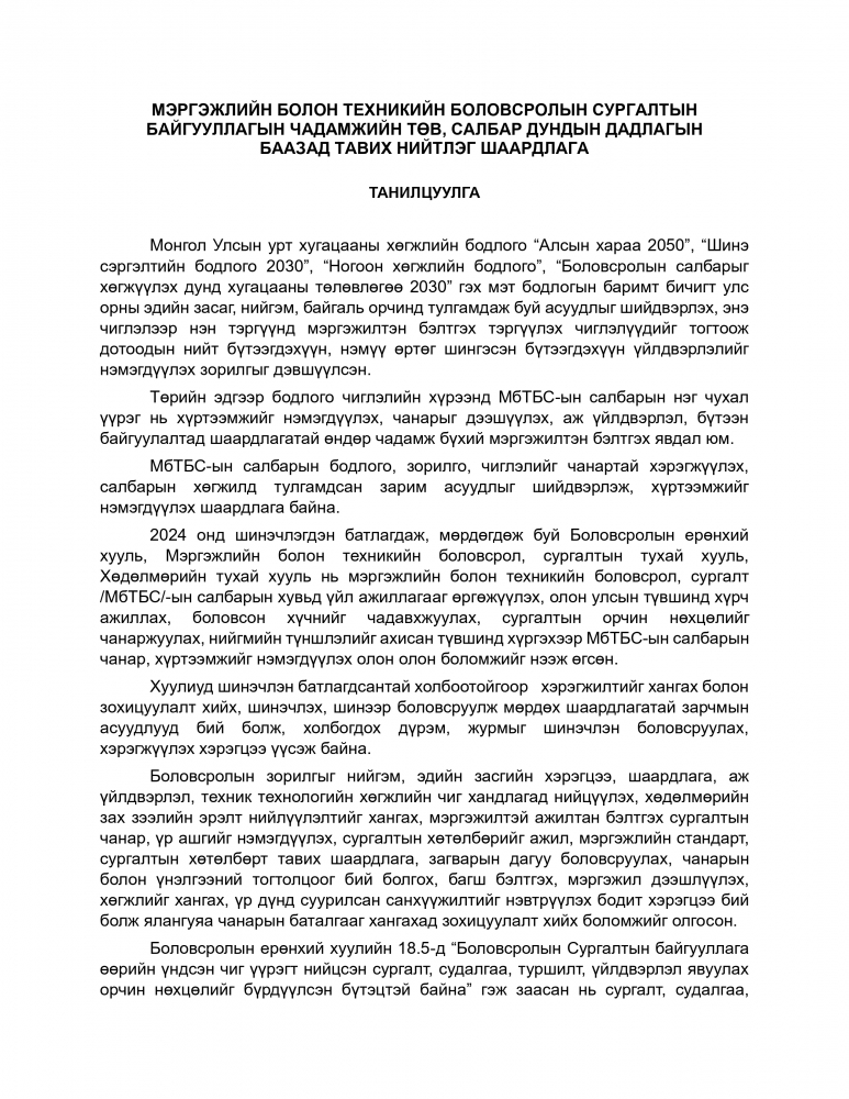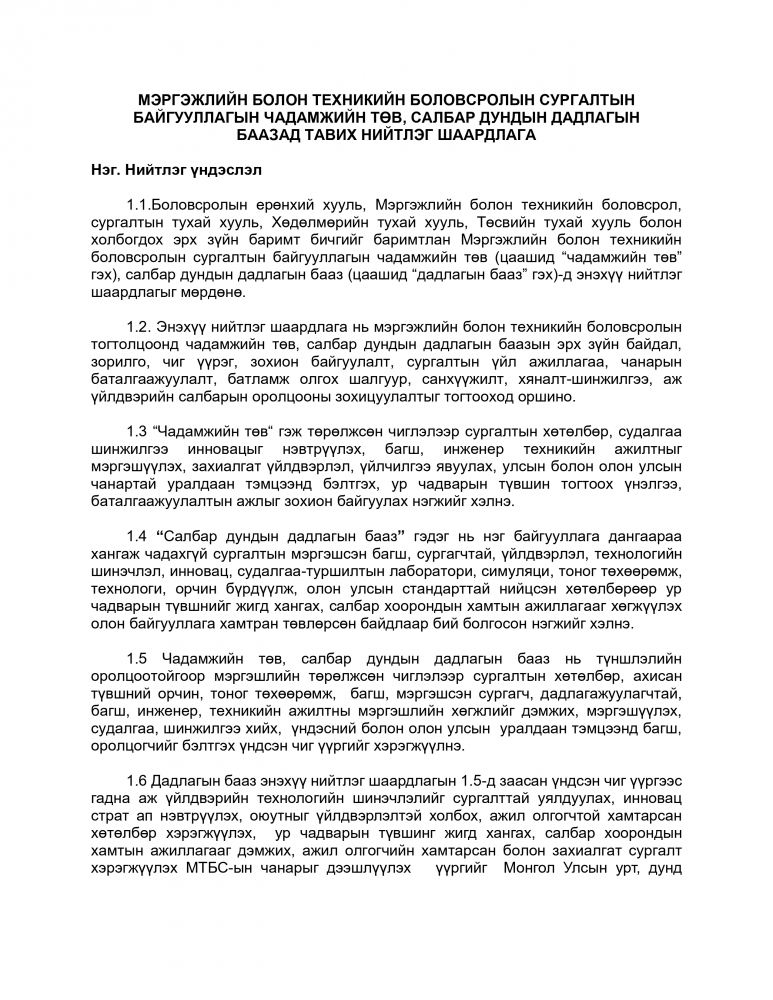 Мэргэжлийн болон техникийн боловсрол, сургалтын тухай хуулийн 9 дүгээр зүйлийн 9.12 дэх хэсэгт “Мэргэжлийн болон техникийн боловсролын сургалтын байгууллага харьяалалдаа чадамжийн төв, салбар дундын дадлагын бааз, гарааны компани, бизнес инкубатор төв, туслах аж ахуйтай байж болно” гэж, 9.13 дахь хэсэгт “Энэ хуулийн 9.12-т заасан чадамжийн төв, дадлагын баазад тавих нийтлэг шаардлагыг боловсролын асуудал эрхэлсэн Засгийн газрын гишүүн батална.” гэж заасныг тус тус үндэслэн “МЭРГЭЖЛИЙН БОЛОН ТЕХНИКИЙН БОЛОВСРОЛЫН СУРГАЛТЫН БАЙГУУЛЛАГЫН ЧАДАМЖИЙН ТӨВ, САЛБАР ДУНДЫН ДАДЛАГЫН