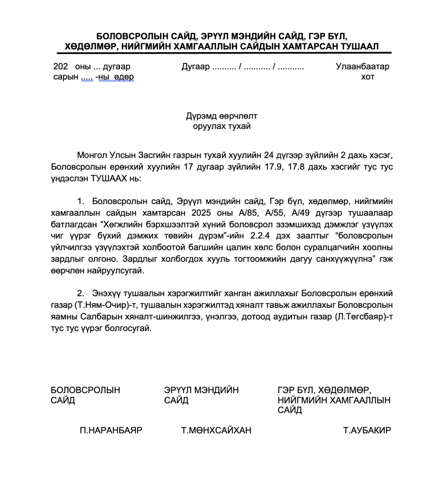 Боловсролын сайд, Эрүүл мэндийн сайд, Гэр бүл, хөдөлмөр, нийгмийн хамгааллын сайдын хамтарсан 2025 оны А/85, А/55, А/49 дүгээр тушаалаар батлагдсан “Хөгжлийн бэрхшээлтэй хүний боловсрол эзэмшихэд дэмжлэг үзүүлэх чиг үүрэг бүхий дэмжих төвийн дүрэм”-д өөрчлөлт оруулахаар “Дүрэмд өөрчлөлт оруулах тухай” Боловсролын сайд, Эрүүл мэндийн сайд, Гэр бүл, хөдөлмөр, нийгмийн хамгааллын сайдын хамтарсан тушаалын төслийг боловсруулан санал авахаар цахимд байршуулж байна. Тушаалын төсөлтэй танилцан amarjargal@moe.gov.mn цахим хаягаар саналаа ирүүлнэ үү.